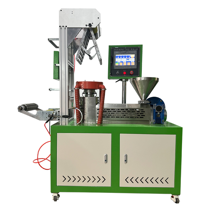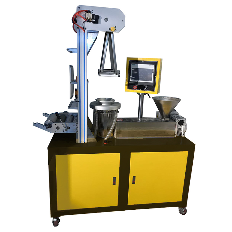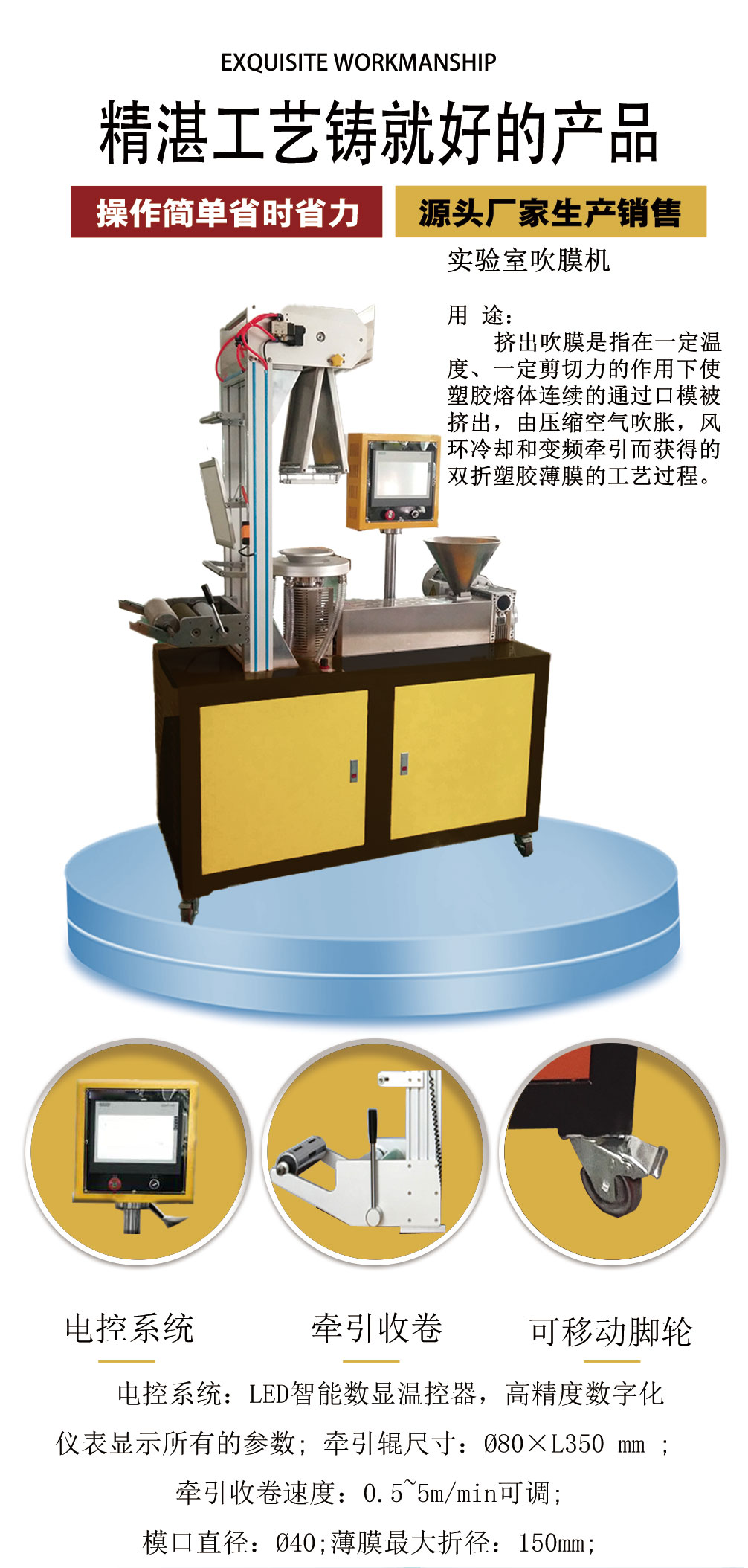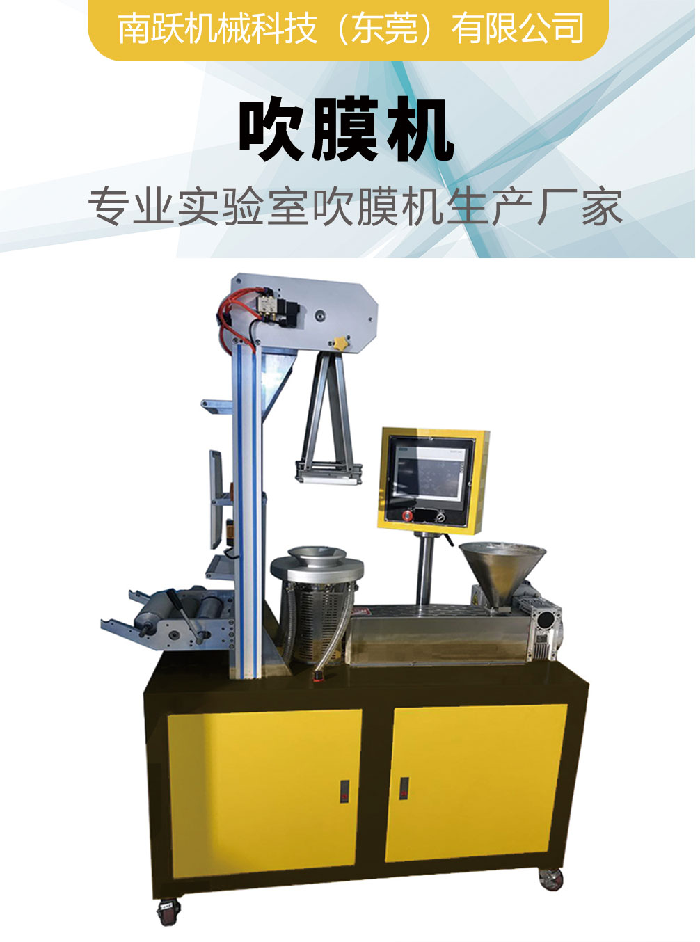 挤出吹膜是在原材料的加工温度上,通过单螺杆输送,在一定的剪切力的作用下使塑料熔体连续不断的通过模口挤出,由压缩空气吹胀,风环冷却和变频牵引,从而获得双折径塑料薄膜的工艺过程。主要用于检测聚合物材料的吹膜可行性和材料内的胶质状况,以及有色分散物、控制混合物、挤出物的分散性